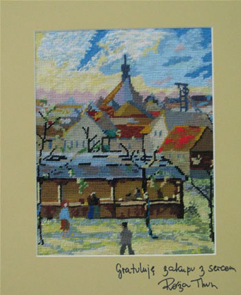nabywcą został Pan Andrzej Cieślik Pan Krzysztof Kołodziejczyk oprócz prac jakie zakupił w czasie wolnej sprzedaży wylicytował również obraz" Bruksela" z podpisem Jerzego Buzka za kwotę 1000 zł. oraz obraz "Polne kwiaty" za 300 zł.